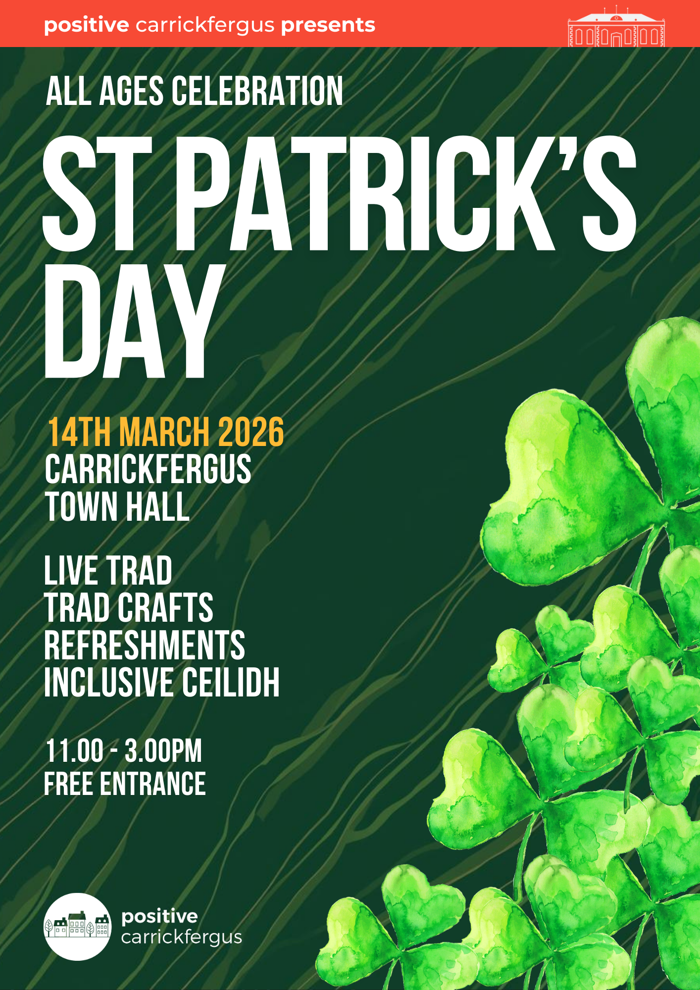 Celebrate St Patrick’s Day in Carrickfergus on Saturday 14th March, 11-3pm in Carrickfergus Town Hall. Positive Carrickfergus alongside their friends in the trad music and craft community are hosting a day of events for everyone to take part in. Enjoy our pop up cafe open for the whole event
