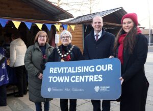 Pictured is traders and visitors with the Mayor of Mid and East Antrim, Alderman Beth Adger MBE and Minister for Communities Gordon Lyons MLA. Larne